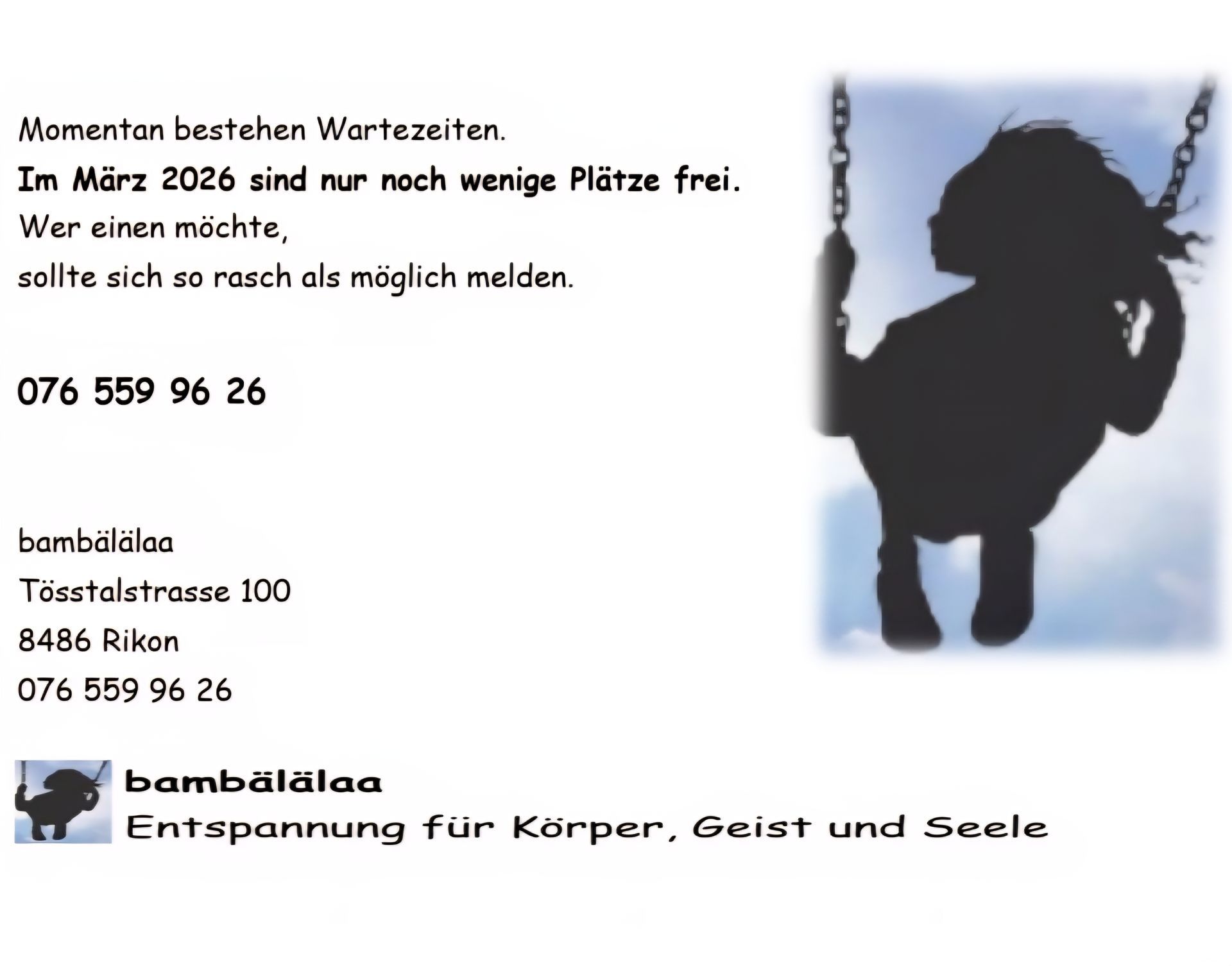(Es bestehen Wartezeiten. Melde Dich deshalb bitte frühzeitig für einen Termin an. +41 76 559 96 26)